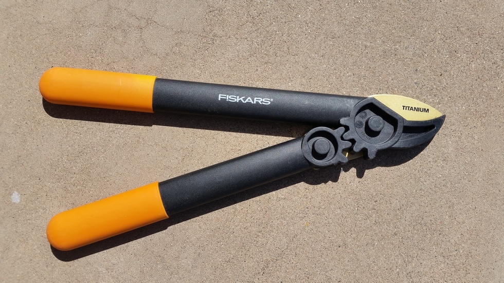 My trusty Fiskars 15" PowerGear Titanium Anvil lopper, weighing it at just over 10 ounces and cuts up to 1.25" branches easily, which I can attest to... even rock-hard dead ironwood branches. Oh yeah, it's "Recognized by the Arthritis Foundation for ease of use"