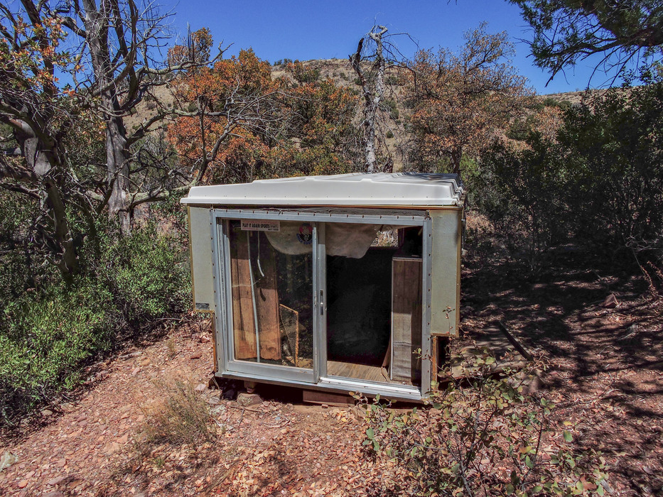 There is a KMLE country radio sticker and a Play It Again Sports, Scottsdale sticker on the back window. KMLE went on air in April of 1980 and the Play it Again Sports in Scottsdale appears to no longer exist. So the camper had to have been placed there sometime after 1980. Looking back at old Google Earth images, the camper is visible back to the June 6, 2007 image. It may not be in the image before that, Oct 4, 2003, but it's difficult to tell because there appears to have been a skiff of snow on the ground.