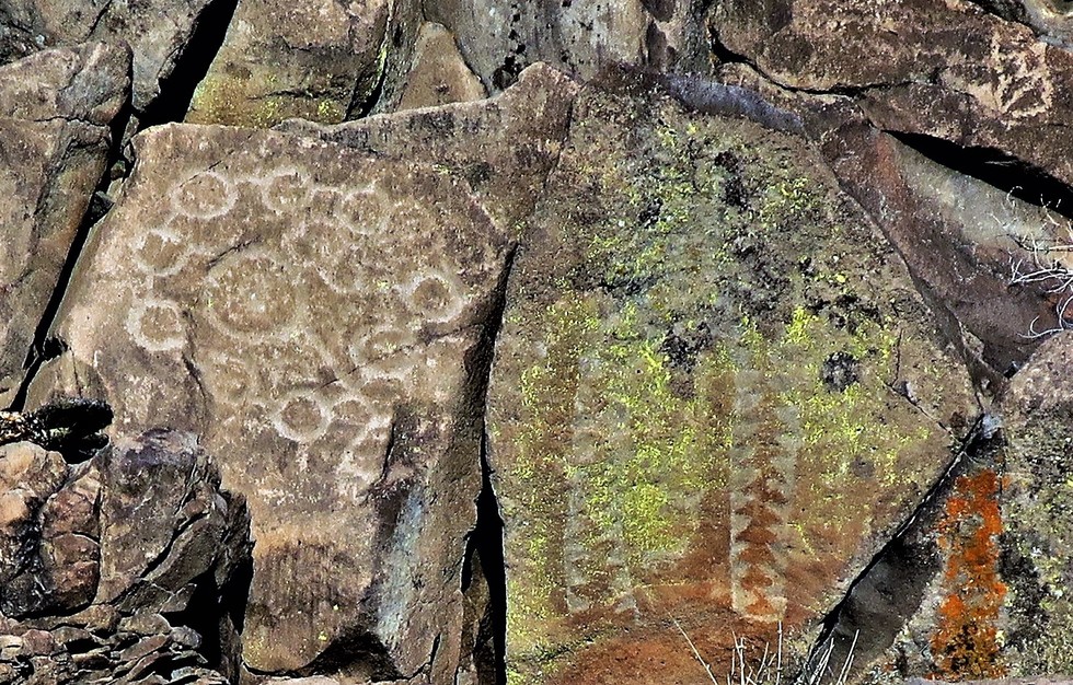 This pair is unique in the area. On the left is one sometimes called the "map glyph" the circles possibly representing villages around the edge of Perry Mesa. On the right sawtooth or xmas tree patterns in negative relief on the reddish stain. In Perry Tank Canyon.