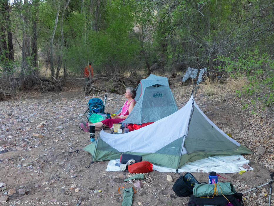 It was 4:15 pm and the heat made us look for camp - Casa De La Luna. We found it in wonderful wash and we lay about in the shade of cotton wood that were just beginning to leaf out. We lolled about for close to 2 hrs before it got bearable to set up our tents (for bugs) and think about dinner... We had tanked up earlier at a cattle trough and spend the time rehydrating ...all I can say is OPPRESIVELY HOT!