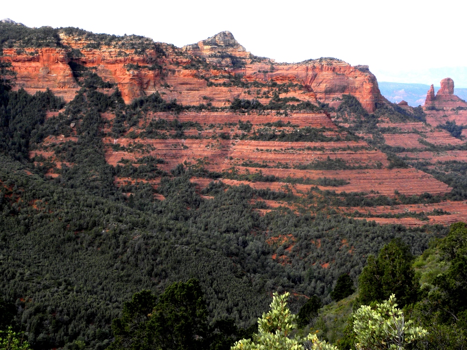 A rising sun touches the red rock, as one looks south when climbing up Casner Canyon trail.