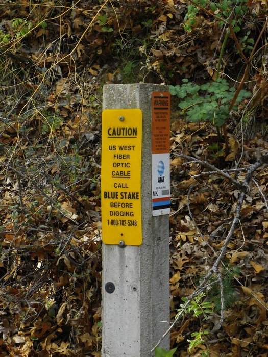 A cable crossing marker. With a bit of reflection one realizes that for our cell phones to work, the towers must connect to a hub, and that connection by-and-large requires fiber cables, if the connection is to have sufficient bandwidth for our 4/5G cellular.