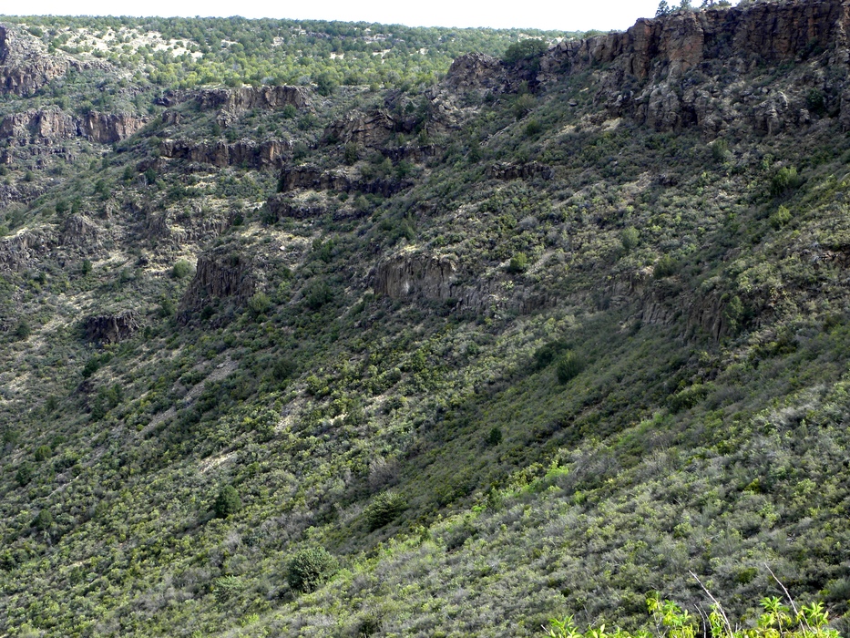 A view of mountain side forest, capped by non-red rock. At the top, the undulating Mogollon Plateau.