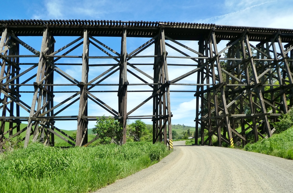 Under we go. The last train left the Camas Prairie in 2000. This trestle is on Reservation Road. This might be Bridge 46.1 is 327 feet long and 51 feet high. The now abandoned Camas Prairie Railroad is an amazing and legendary railroad that climbs from an elevation of 745 feet in Lewiston, Idaho to over 3700 feet at its High point. The abundance of tall trestles along this line earned it the nickname