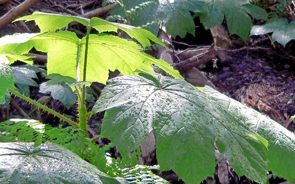 The morning dew and sunlight on this plant. Lots of green plants but not much color because not much sun gets through.