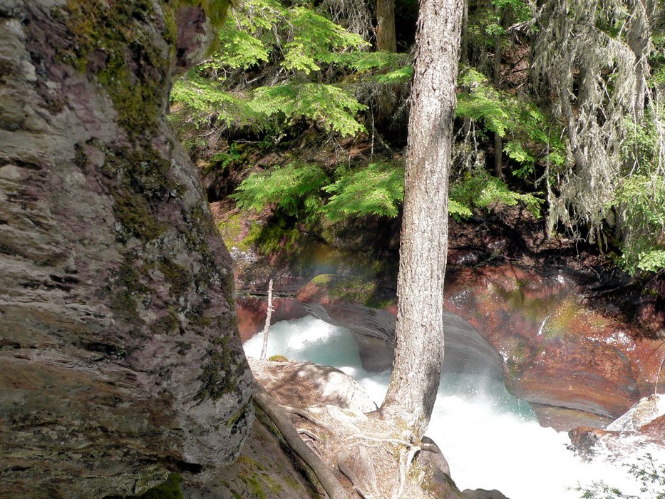 This is quite a scene of the water rushing into the gorge. You can see how it has rubbed the red rocks so beautifully. And then you have hanging moss on a tree too.