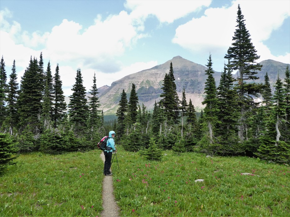 Wendy looks back as we walk thru one of several meadows here. Red Mountain is behind her.