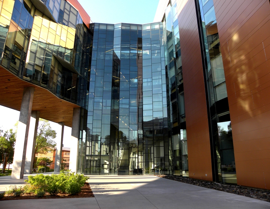 Again Health and Sciences, but now the interior court. Again visually impressive. Behind the glass facade, almost visible, the open and inviting stairwell encourages and enables spontaneous interplay between faculty members and with students. Note the implementation of the theme. i.e. angularity and red hues, but in a manner different, almost discordant, with other buildings, and even with this buildings own facade on the exterior court side.