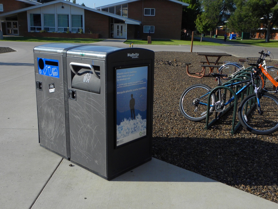 Bike racks, recycle and solar compactor bins, and the odd, random picnic table. And a building with an angular roof line. Is the angularity of multiple buildings a happenstance, or a realization by individual architects of a design feature that can unify their building with the rest, or a explicit theme the University requests the architecture to consider?