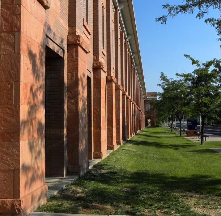 The Cline Library. Red hues, and a classic aura, with long, linear lines; broad, strong columns; and repeating, symmetric units. But no angularity, and no glass facades. Nonetheless, on its own, common themes aside, an appealing form and design, as I view it.