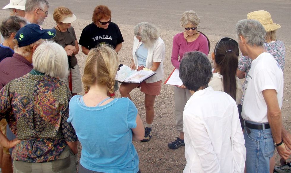 Joanne Oellers of the Center for Biological Diversity (pink shirt) explains the importance of the Verde Headwaters. The Verde River is in grave danger from a proposed pipeline that will pump water directly from the aquifer that supplies water to the upper Verde. This hike, sponsored by the Center, aims to educate the public about the beauty of the upper verde, and the dangers facing it.