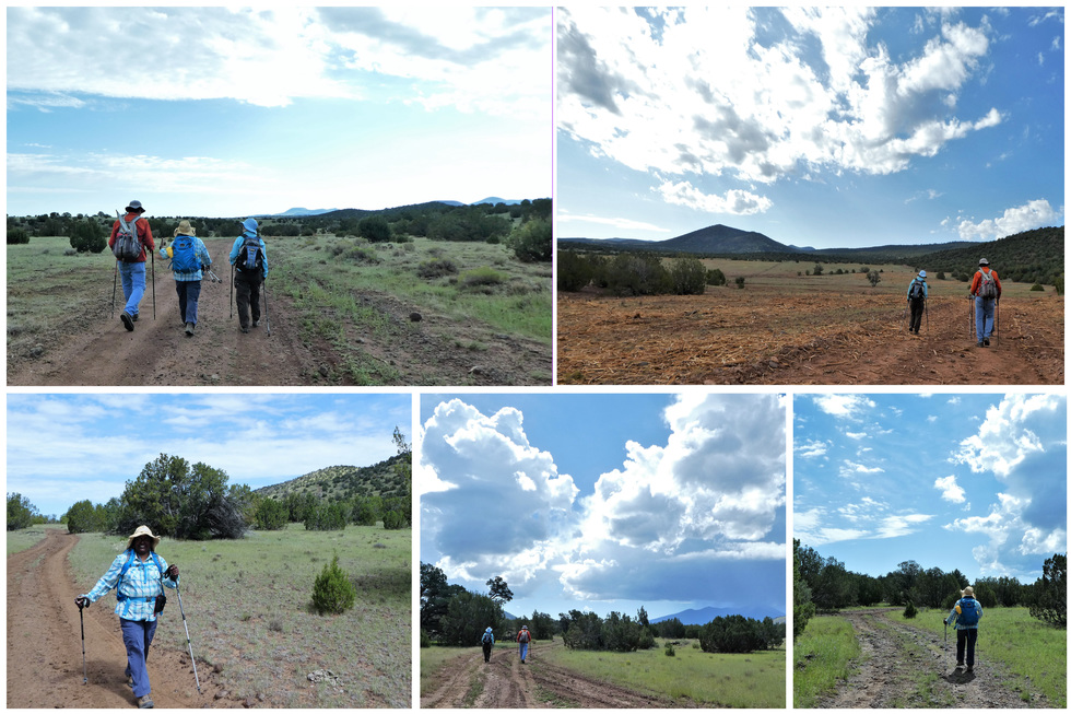 a collage of three members of the AZT Section Crew. The nice thing about road walking is you can walk side by side and carry on a decent conversation. UR is Missouri Bill Hill in the distance. Bottom three photos are when we are up on somewhat of a plateau from where we started heading toward our campsite at FR 523.