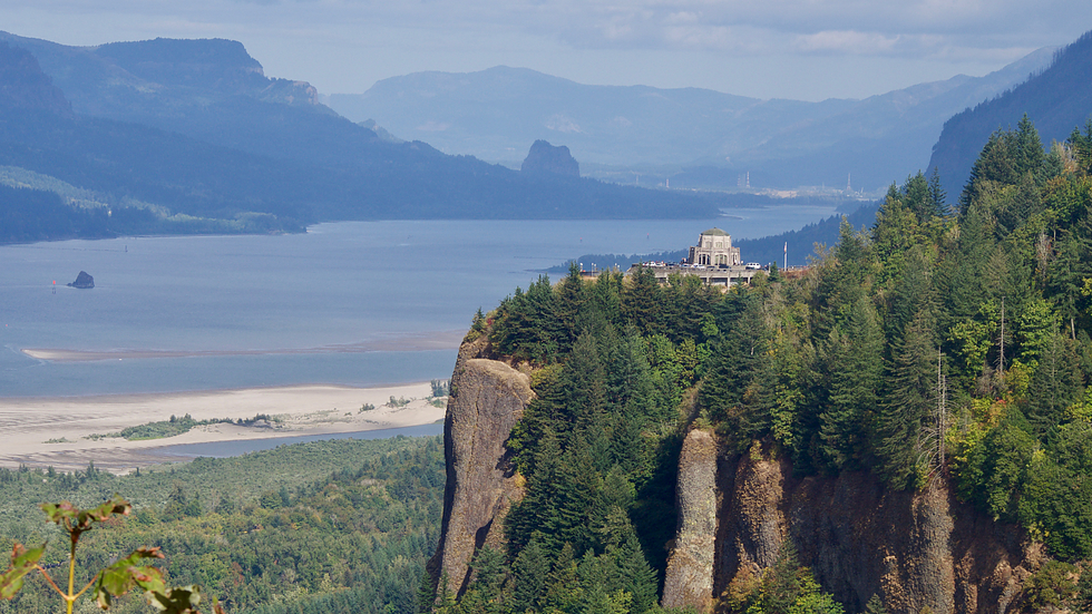 Upper closer view of the historic Vista House, Crown Point, and upstream along the CRGNSA to the iconic Beacon Rock, with the Monte Cristo Range in the distance. The Vista House sits on a cliff that's 733 feet above the river. A fantastic octagonal stone structure, it was built 100 years ago, in 1918.