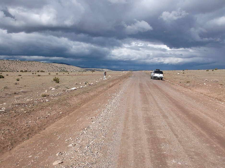 Mrs. Trail Angel Extraordinaire looking for heart-shaped rocks. The 2nd spare tire tied to the roof was a loaner from our tire store. The tire man said, "If you only have one, you'll use it. If you have two, you won't use either." He proved to be prophetic. Over 20 miles of dirt roads, and not a single problem.