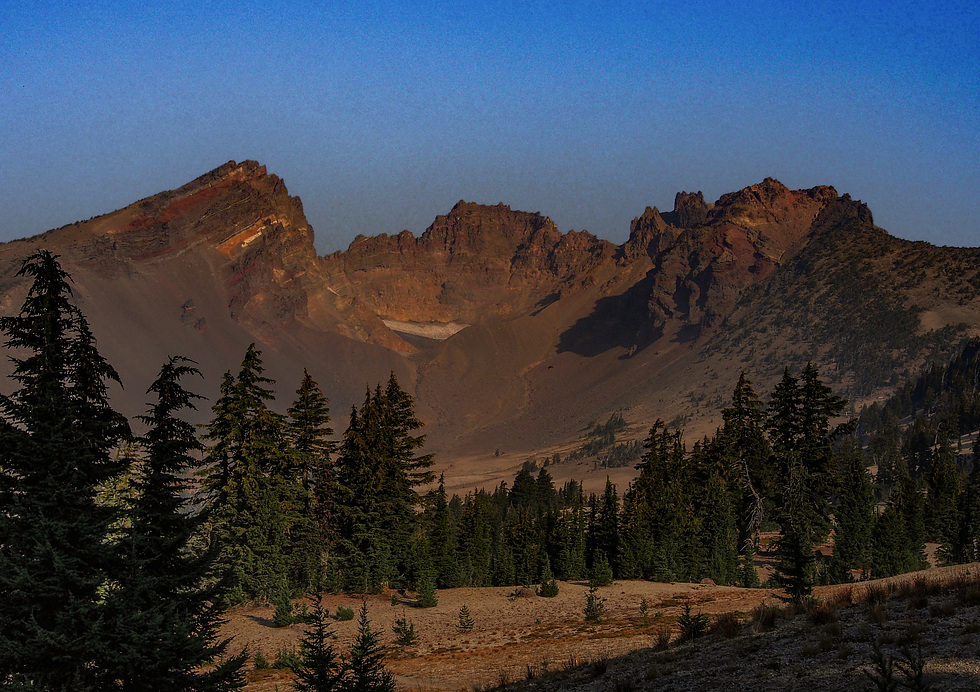 This view of the Broken Top crater dominates the view starting out on the trail. The wind had shifted overnight and brought in a layer of wildfire smoke which diminished what I consider to be some of the most spectacular views in the Three Sisters Wilderness. Some manipulations with Photoshop has cleared up this photo to some extent but I couldn't filter out the grainy dark haze outlining the top of the peaks.