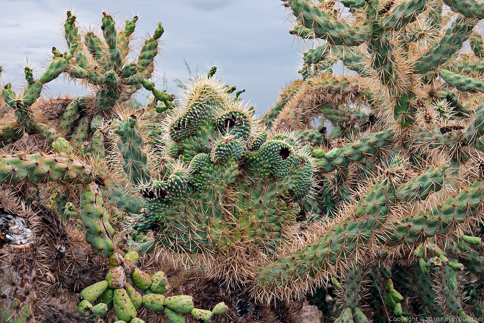 This prickly pear appears to be growing out of the chain fruit cholla. It's several feet off the ground and there did not appear to be a prickly pear plant below. One speculation is that a bird excreted some prickly pear seeds onto the cholla which then grew.