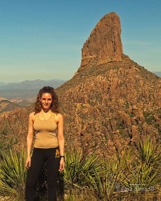 Julia with Weavers Needle in the background. She wanted to go out to Pinon Point, but saving that for another trip...
