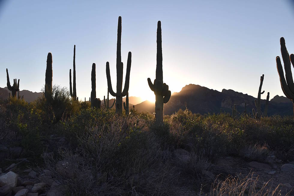 Saguaros with arms up greeting the sun.