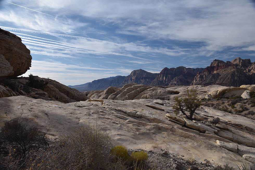 This white sandstone in the foreground is the same type sandstone as in the cliffs just below the red sandstone in the distance. This thrust fault acted like dominoes when they are shoved together, one domino rides over the other and the one behind that rides up over that.