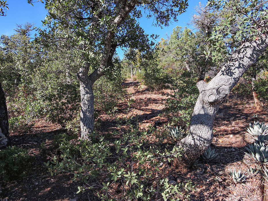 Photo of the mystery trail that can be seen on Google Earth. Tree branches had been trimmed to clear the trail as can be seen in this photo. In other places manzanita had been pruned from the trail. All branch cuts looked fairly old as shown by the tree growing around these old cuts. There was no evidence of recent pruning along the trail.