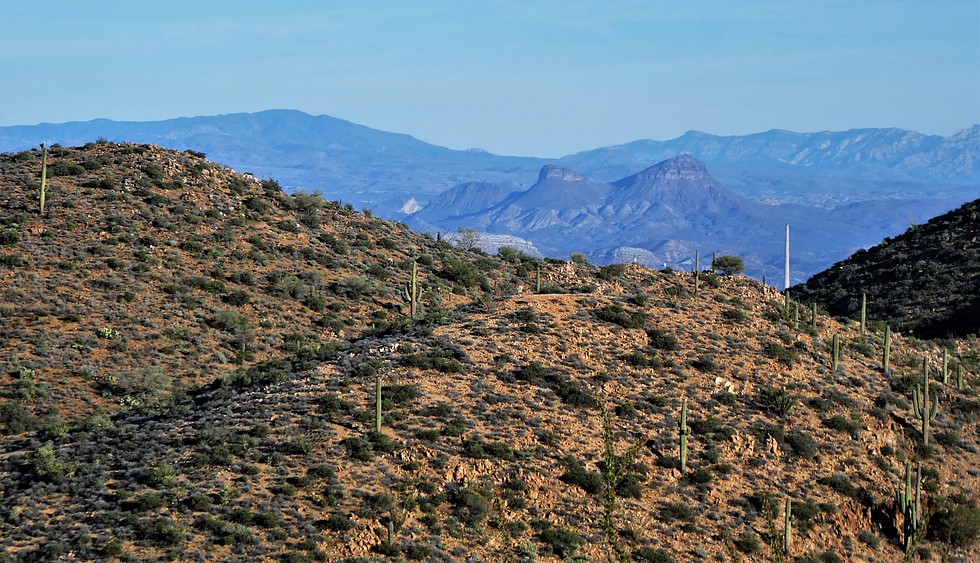 still exploring the area around us here. You can see the smoke stack to the right with Tam O'Shanter Mountain? behind? The Pinalenos are to the left and ? Dripping Spring ? mountains to the right. Is there anywhere one can find a simpler way to figure out the mountain ranges?