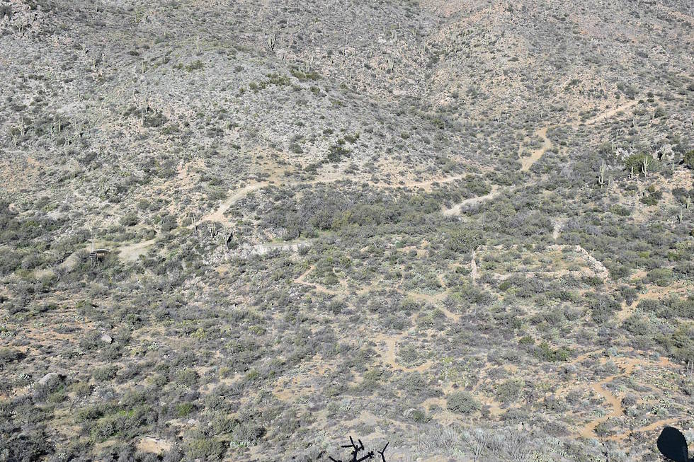 Dropping back down into Wild Burro Canyon with its solar windmill, back filled dam and rock corral. I believe is the Goat Corral