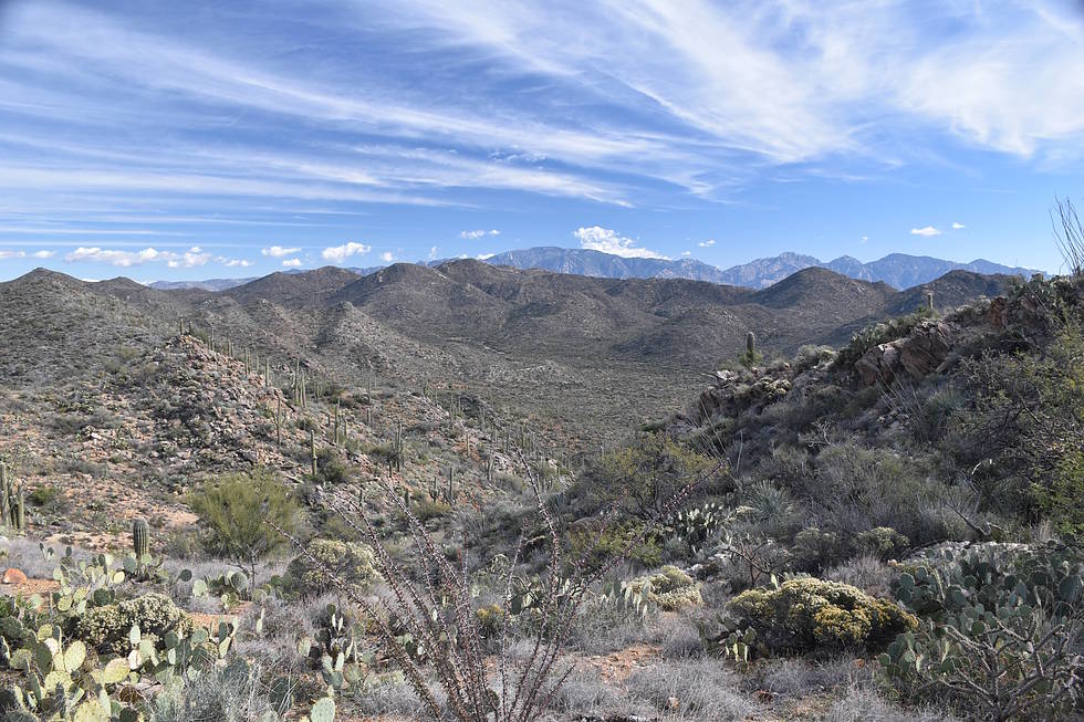 View of Catalina Mountains to the Southeast from the high point on the cross country section of the hike. I think I got stuck by every possible plant that can stick you on this section.