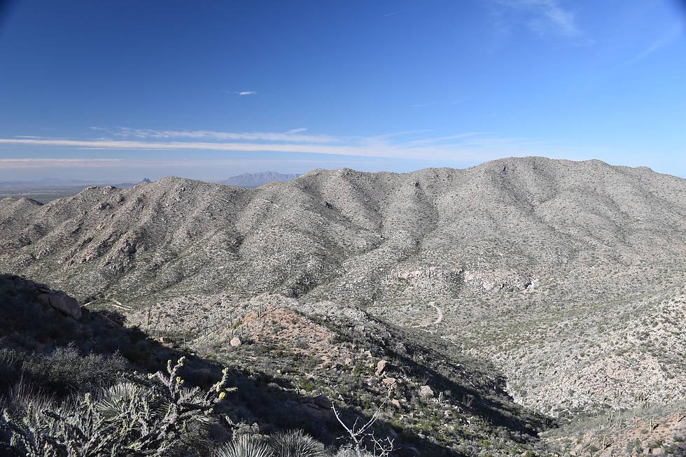 Looking down into Cochie Canyon. The route will head down to the saddle just below center photo and then head down the ridge to Cochie Canyon. This section between here and the saddle was the worst section, lots of pointy sharp yucca, cholla and catclaw. I donated my share of blood on this little section.