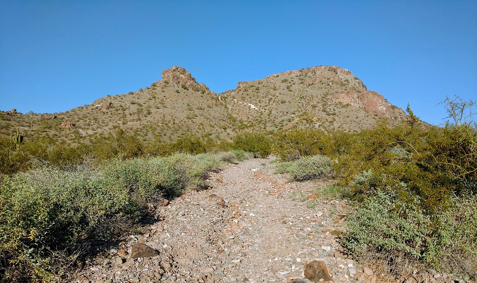 a different perspective of the steep climb where you see the white line between the two humps. Nope, glad I'm not doing that today. I'm still on the lower trail that is slowly taking me up. I had taken it all the way to the housing area and headed east until it seemed to peter out so I ended up coming back up this way.