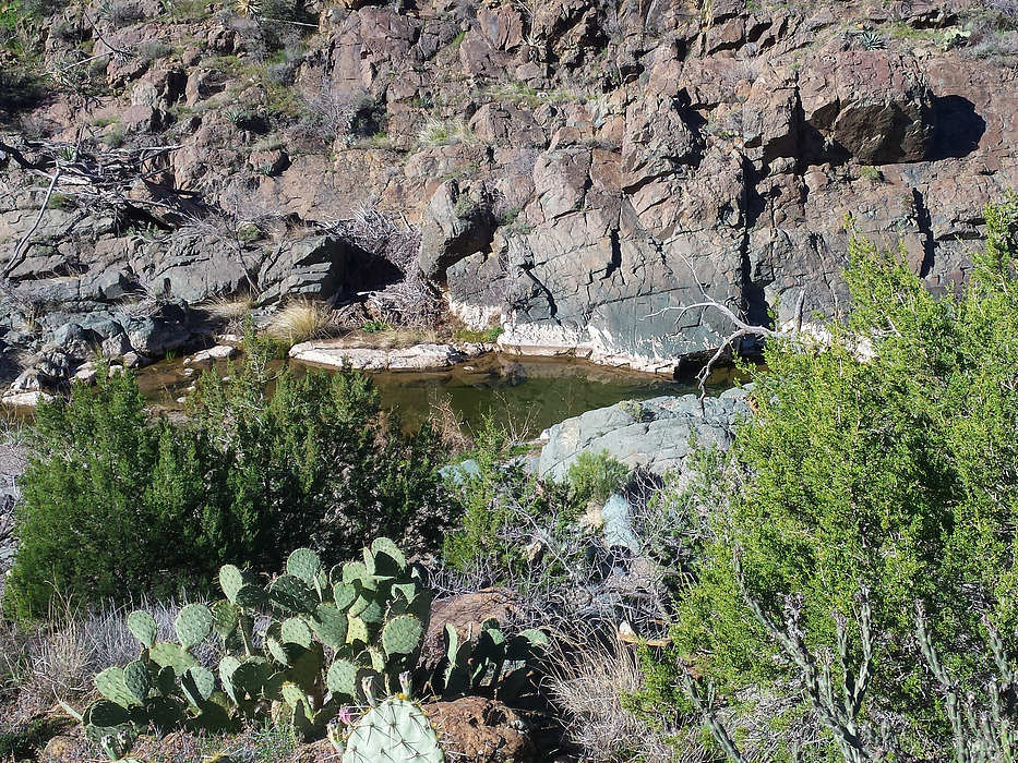 One of many "Emerald Green Pools" in the canyon narrows. These pools were likely the source of the name, Emerald Lode, given to the "the small but immensely rich gold deposit" found in 1877 on the hill above these pools by two prospectors. The hill was later named Cramm Mtn after one of the two prospectors, Richard Cramm. Cramm camped at the base of the hill for several years working the mine while his partner went on to search for riches in California. Cramm stayed at his camp for a number of years but never patented the Emerald Lode and it eventually was abandoned. Info from "Cave Creek and Carefree Arizona - A History of the Desert Foothills" by Frances C. Carlson