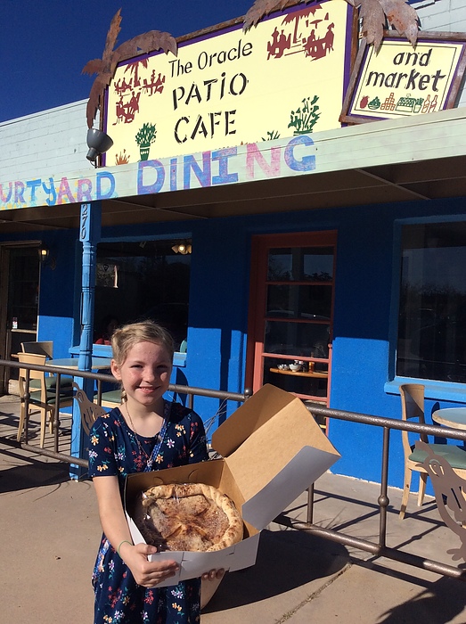 Bianka and her choice of a giant, freshly baked Peach Pie from the Oracle Patio Cafe, our after Arizona Trail hike special treat for tonight’s sunset!