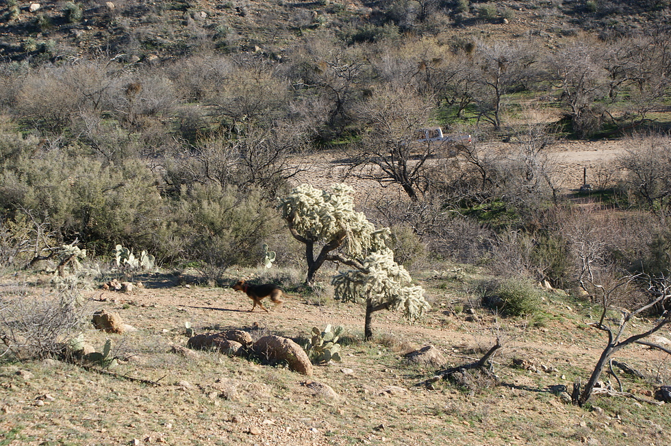 Switchbacking up out of Tucson Wash NOBO... our Tacoma parked at the Tucson Wash AZT Crossing