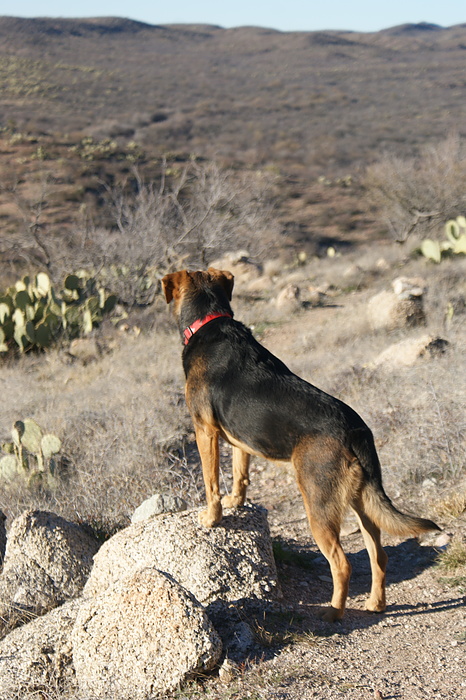 Fenix looking off into the distant mountains towards Mountain View Tank and Antelope Peak