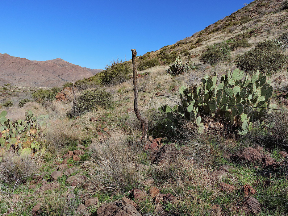 Woven wire fence partially intact at the south end of the rock fence. The woven wire was somewhat loosely attached to the posts by wrapping a piece of wire around the post and the top strand of woven wire and doing the same for the bottom strand. I saw no evidence that he middle strands had been attached to the post and wire staples normally used to attached barbed wire to posts had not been used.
