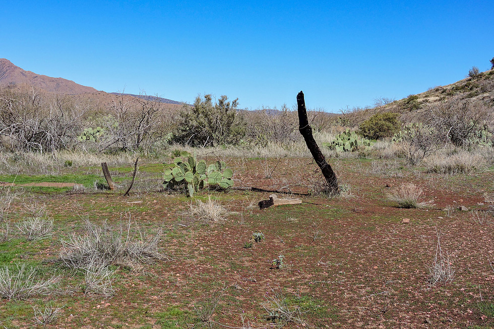 The section of rock fence that I was checking out on this hike is on a bench about halfway up the east side of the canyon. This was the first evidence that I found of a section of woven wire fence which was connected to the north end of the that section of rock fence. This charred post had been part of a gate in that fence.