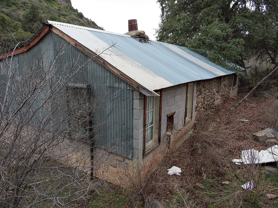 The back of the house showing the center rock wall section which was probably the original ranch house/cabin built by William (Billy) Cook. Note the curtains still hanging in the bathroom window. Also note that the roofing appears to have several fairly new sheets of corrugated metal.