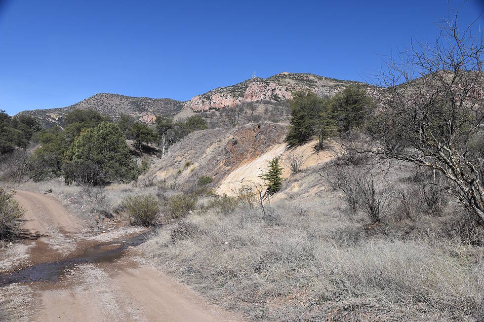 Road up to Red Mountain. Red Mountain is actually the lower peak to the right of the one with the towers according to maps.