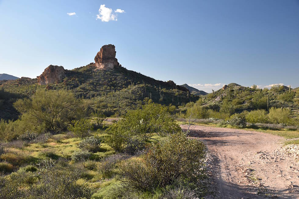 Willow Spring Canyon Trail from near the Trail Head. Gold Eagles Nugget Trail will head west through the canyon to the left of the two rock outcrops. I'm sure these rocks have names but I don't know what they are, being an engineer I will name them Rock #1 and Rock # 2.