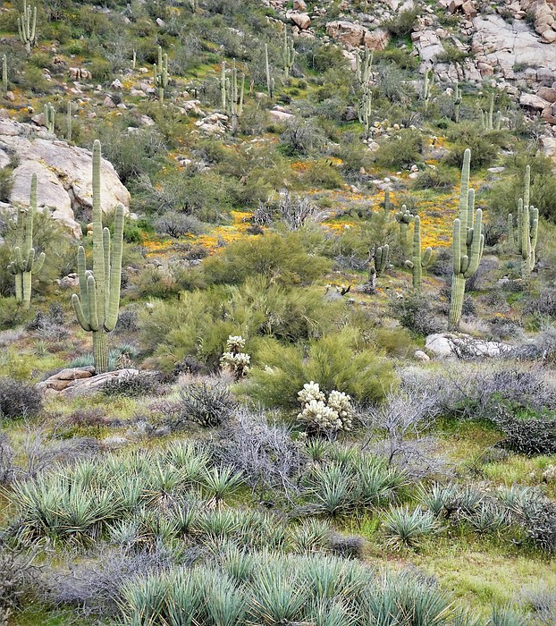 another drainage of poppies coming down from the hillside via the saguaros, palo verde foothill trees, cholla cactus and yuccas.