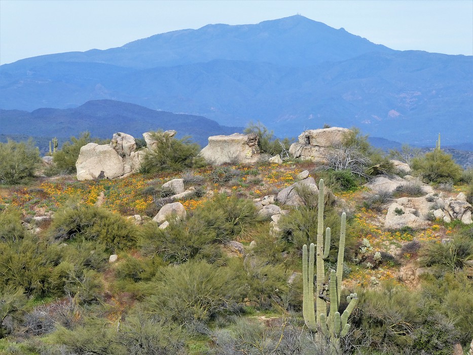 a smattering of poppies up on boulder formation hill with Mount Ord in the background and the Salt River in-between (you can't see the river but I know it's there)