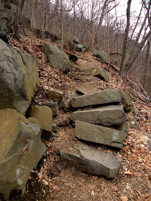 The cliff line along the Palisades rises up to 500 feet above the river, in a steep ascent. Many sections of the ascending trails feature steps. While these show the mark of time, I reflect on the work needed by trail crews to haul and set these fairly massive stones into a functional staircase.