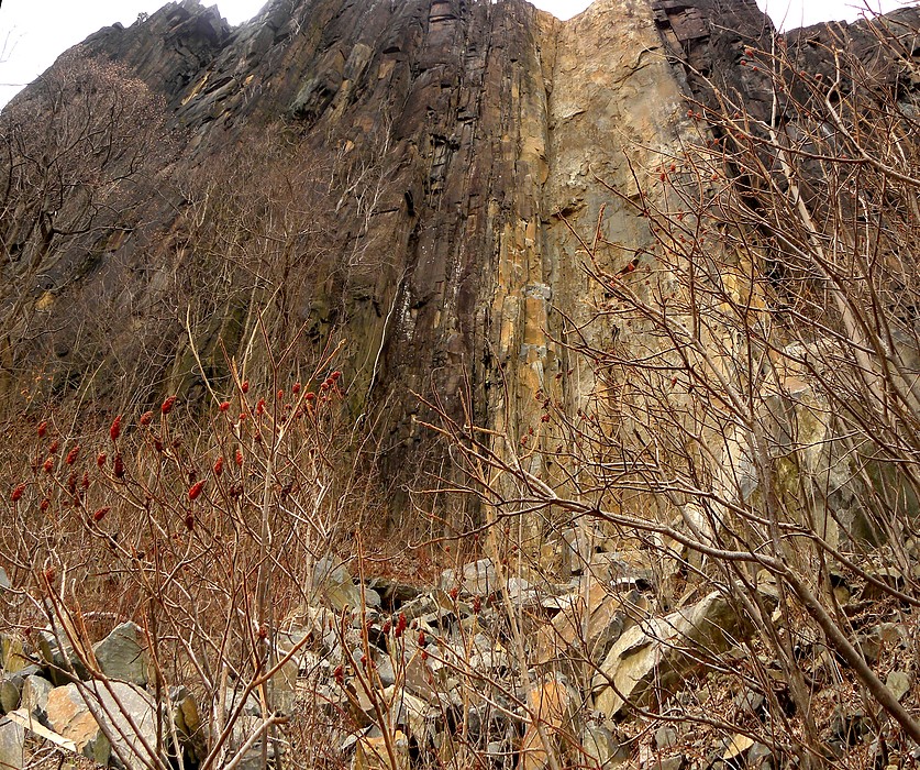 A view of the Palisades Cliffs from below. The Cliffs, according to geology references, consist of magma that intruded then cooled inside fissures in overlying softer rocks. The softer rocks (like sandstones and shales) eroded away, leaving the harder solidified magma standing, here a combination of feldspars and augites (For the curious, augite for example is (Ca,Na)(Mg,Fe,Al)(Si,Al)2O6.)