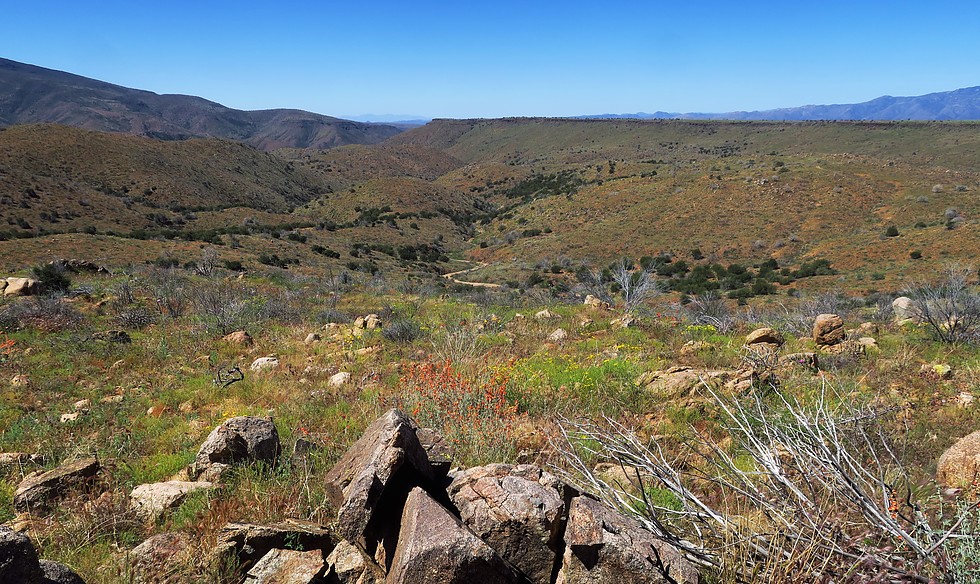 I'll meander cross country to the left and down the ridge toward the mesa edge.
