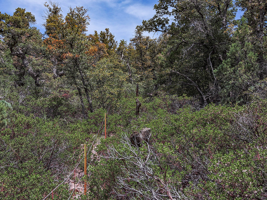 Although this second trail was also visible on GE I had not seen the fence. I suspect the trail had been established for putting in the fence. The fence mostly used metal posts which had faded and started to rust with time. There was evidence of a much older fence with wooden posts which had been replaced by this "newer" fence.