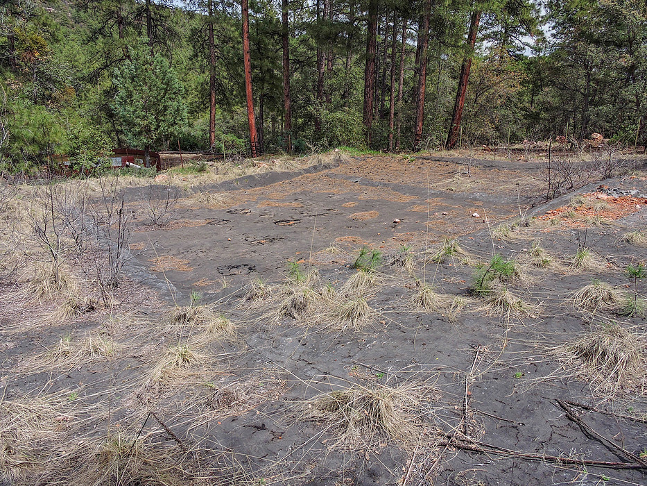 Water collection basin for the open topped metal water tank. The ground was covered with what appeared to be tar covered roofing material to collect water and directed to a 6 inch pvc pipe leading to the tank. A water trough was positioned downhill from the tank.