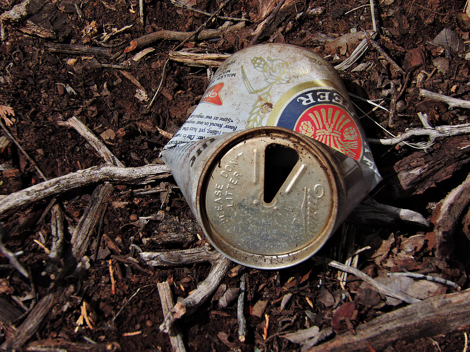 An old pull tab aluminum beer can laying at the edge of the trail. The labeling on the opposite side of the can which had faced up before I turned it over was completely faded by years of sun exposure. This type of pull tab was discontinued by 1983 so it appears this trail was in use at least 35 years ago.