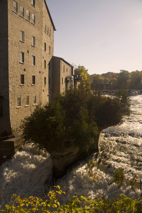 The "Tooth of Time" beside the Elora Mill (and distillery), Kayakers were shooting the rapids while were were walking along the gorge rim...