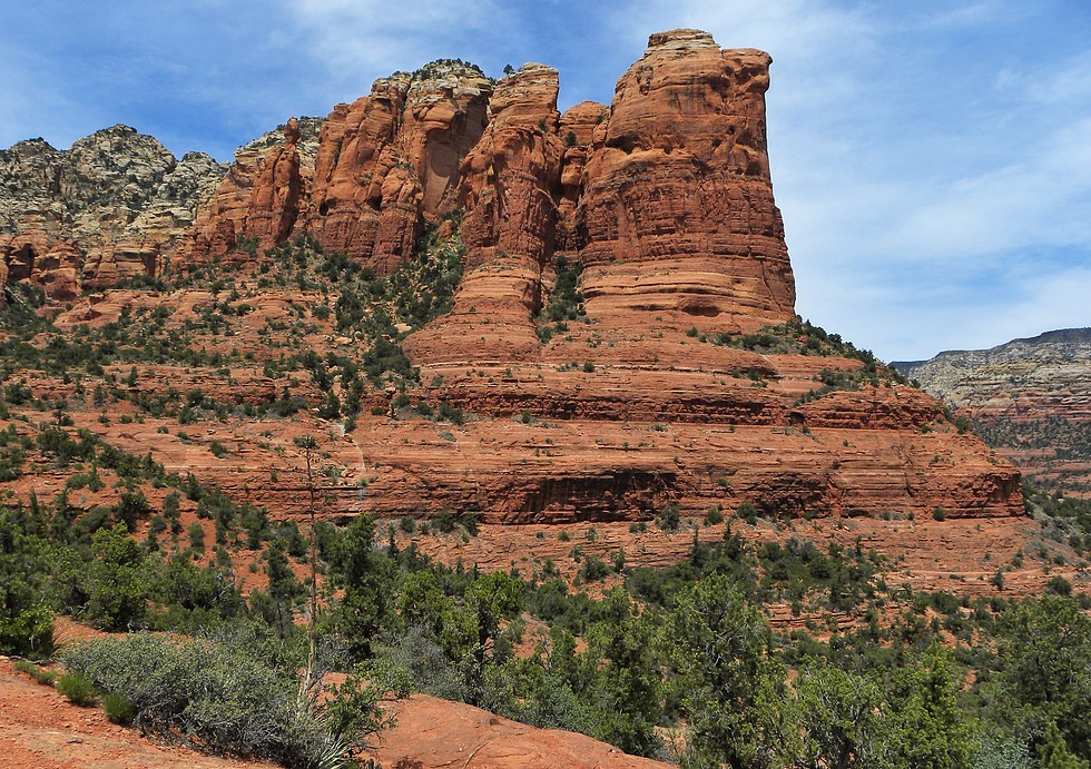 Coffee Pot Rock, from the vantage point of Teacup Trail, with Capital Butte in the background in the upper left. The differing strata result from differing deposition environments - arid deserts, river flood plains, tidal coastlines, ocean shelves. The red, vibrant, stems from iron oxide leached from water filtering through the strata through the eons.