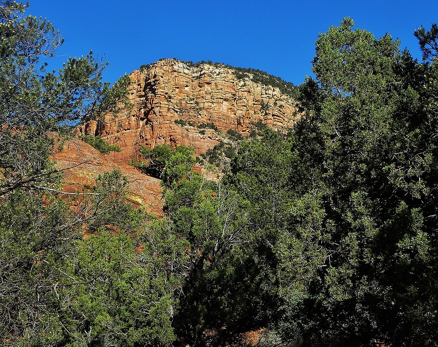 Red rock formations rising above the juniper and pine forest. Note here the horizontal lines in the formation, indicating I believe a likley river or near shore deposition environment