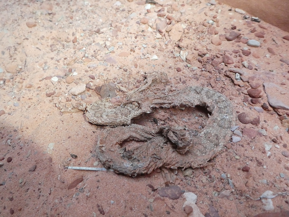 Dead rattler. Also found a dead bat, a dead butterfly, and lots of jet-black fur (skunk remains?).